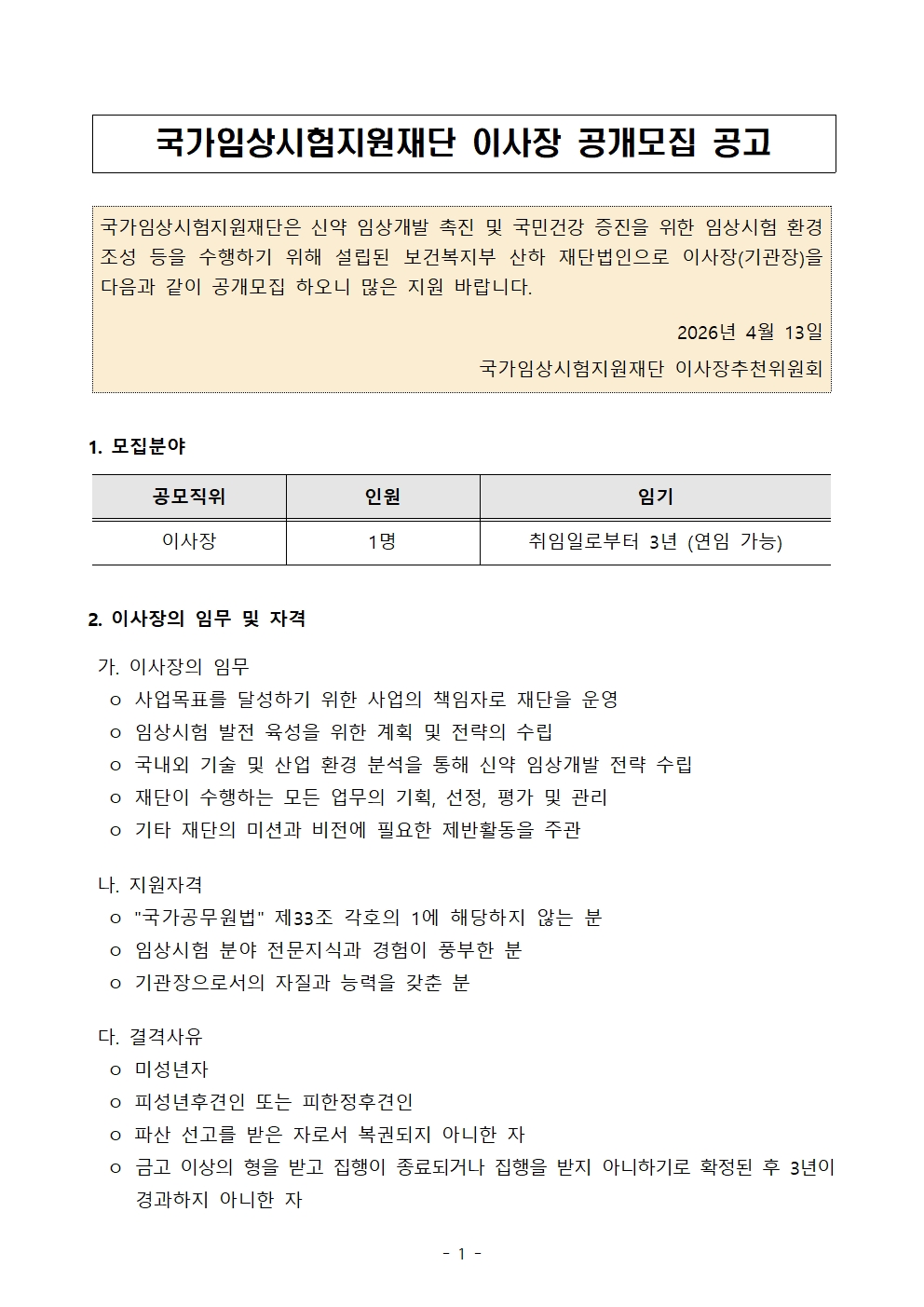 국가임상시험지원재단 이사장 모집 공고문.hwp 국가임상시험지원재단 이사장 지원서.hwp
