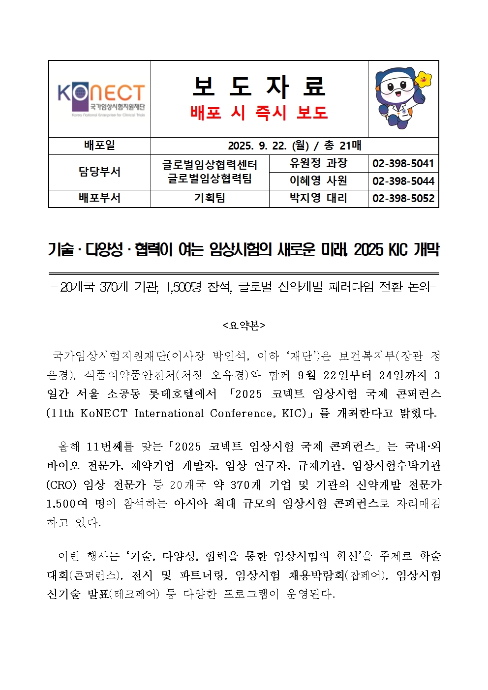 이전글 [보도자료] KoNECT, 「2024 한국 임상시험 산업 정보 통계집」 발간 2025.09.29