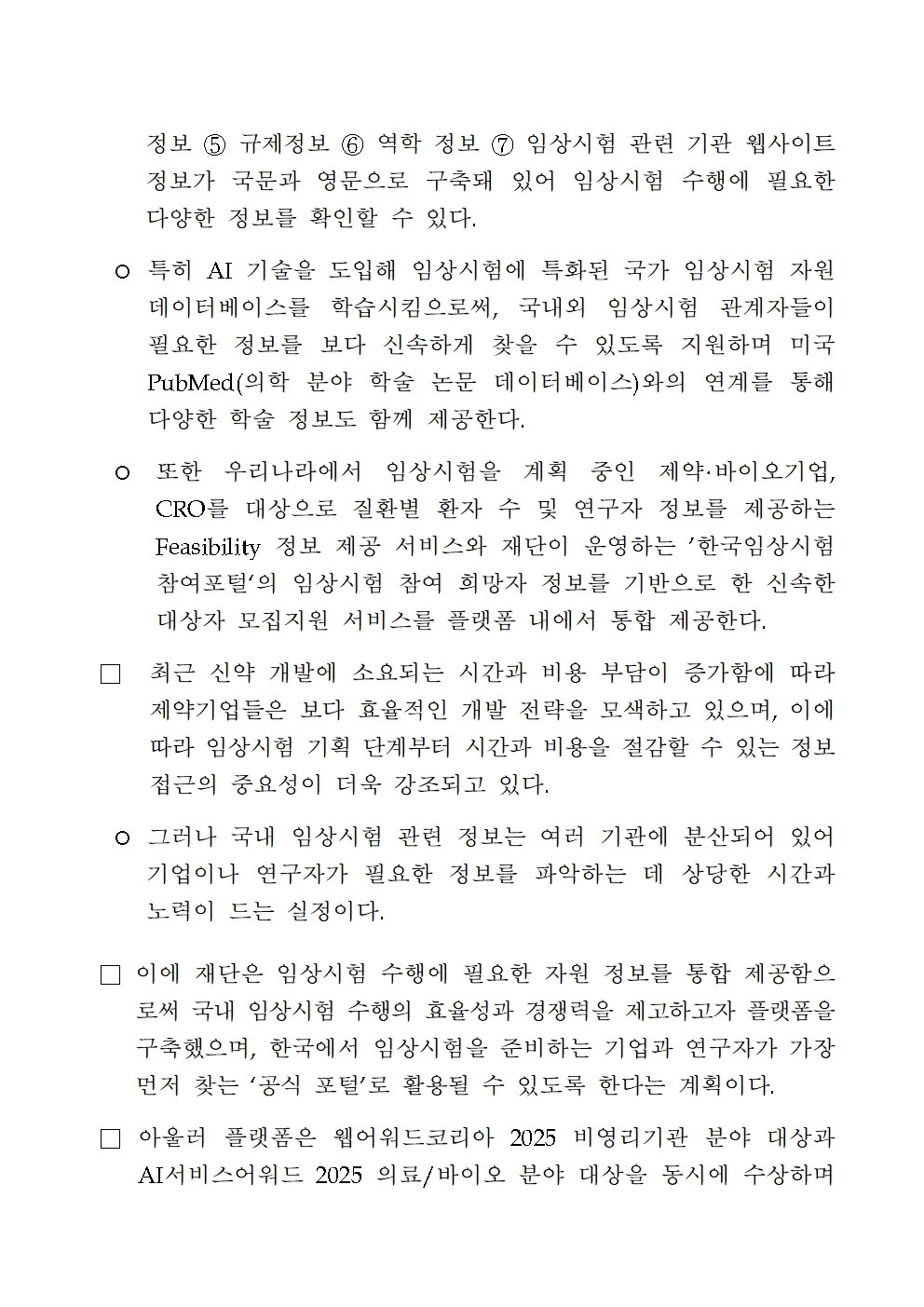 임상시험 통계 생산 및 정보 제공 공익적 임상시험 지원 공공 플랫폼 운영 상담 서비스 지원