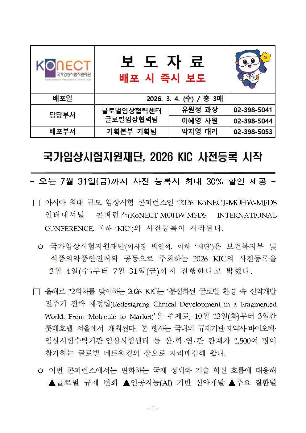 다음글 [보도자료] 국가임상시험지원재단, 수요자 맞춤 교육 참여 기관 모집 2026.02.11