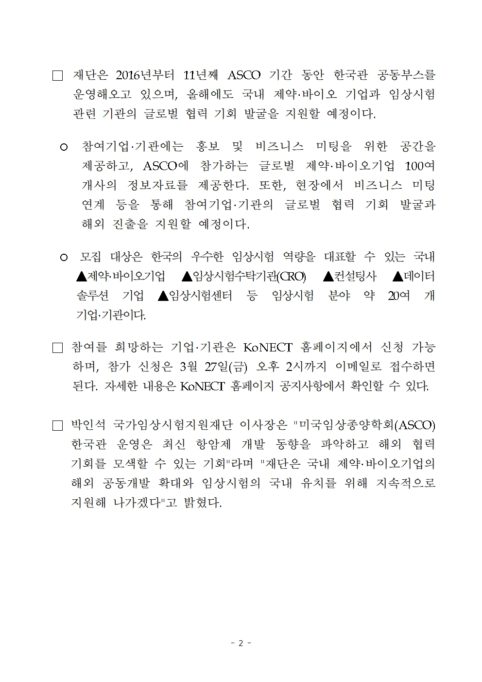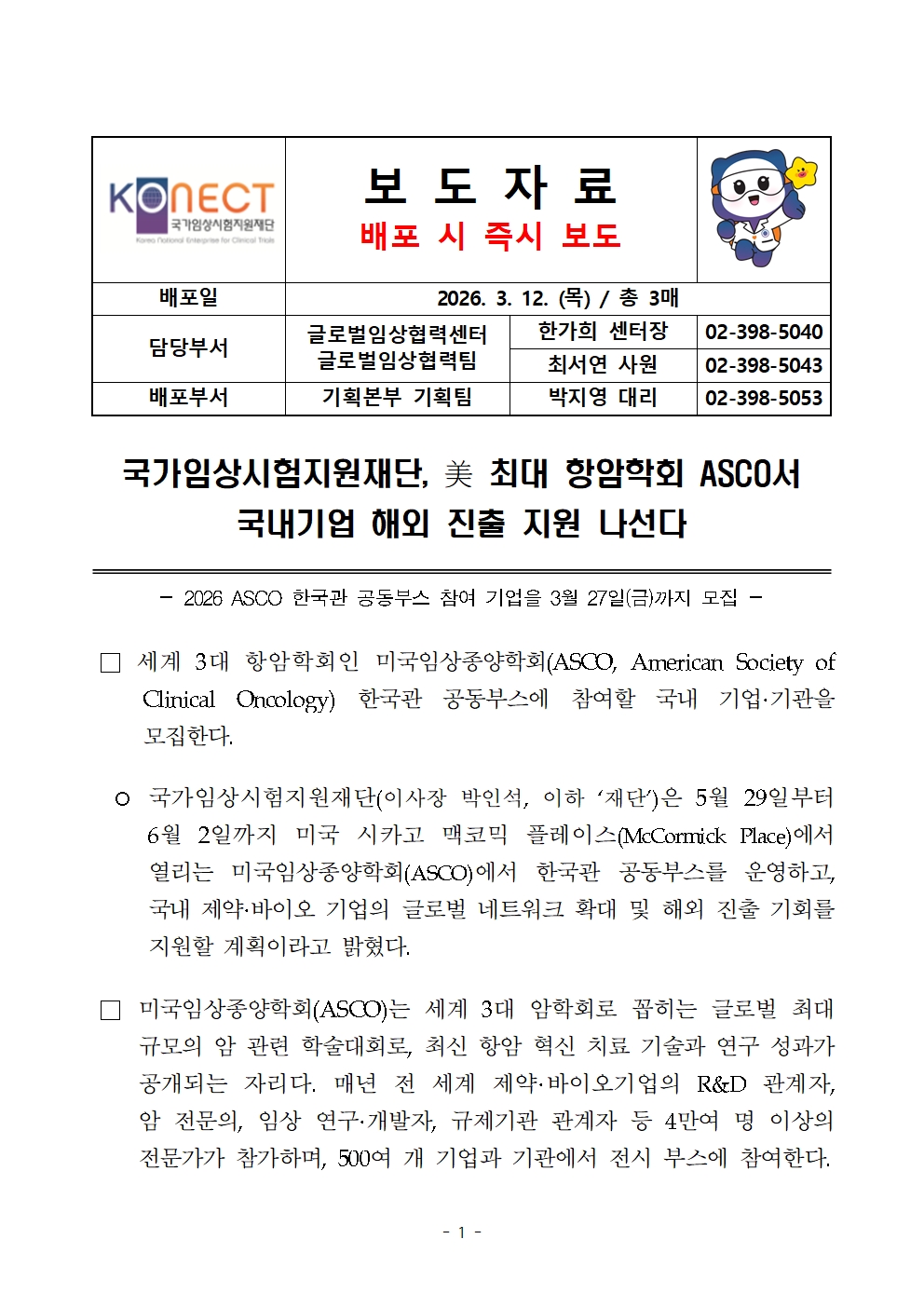 [보도자료] 국가임상시험지원재단, 美 최대 항암학회 ASCO서 국내기업 해외 진출 지원 나선다_최종본(260312).hwp