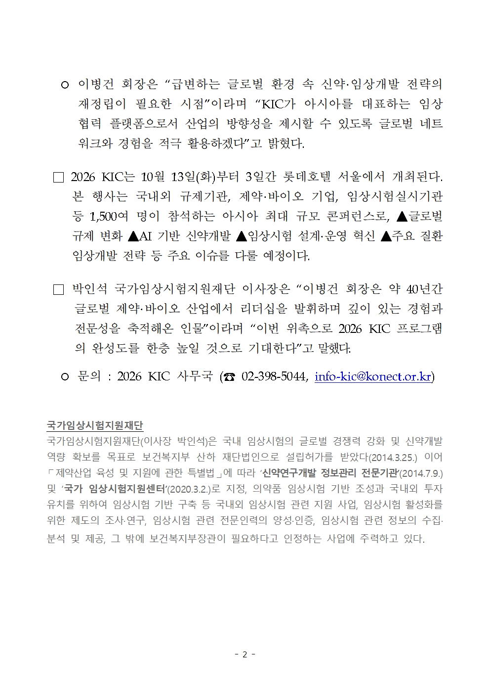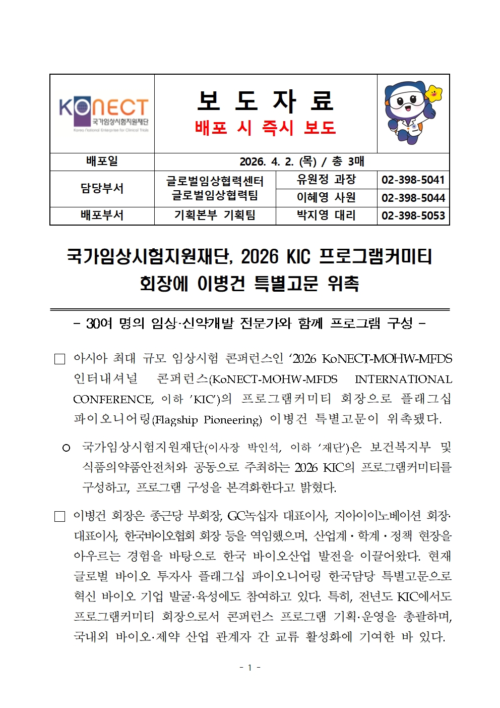 20260402_[보도자료] 국가임상시험지원재단, 2026 KIC 이병건 특별고문 프로그램커미티 회장 위촉_최종본.hwp